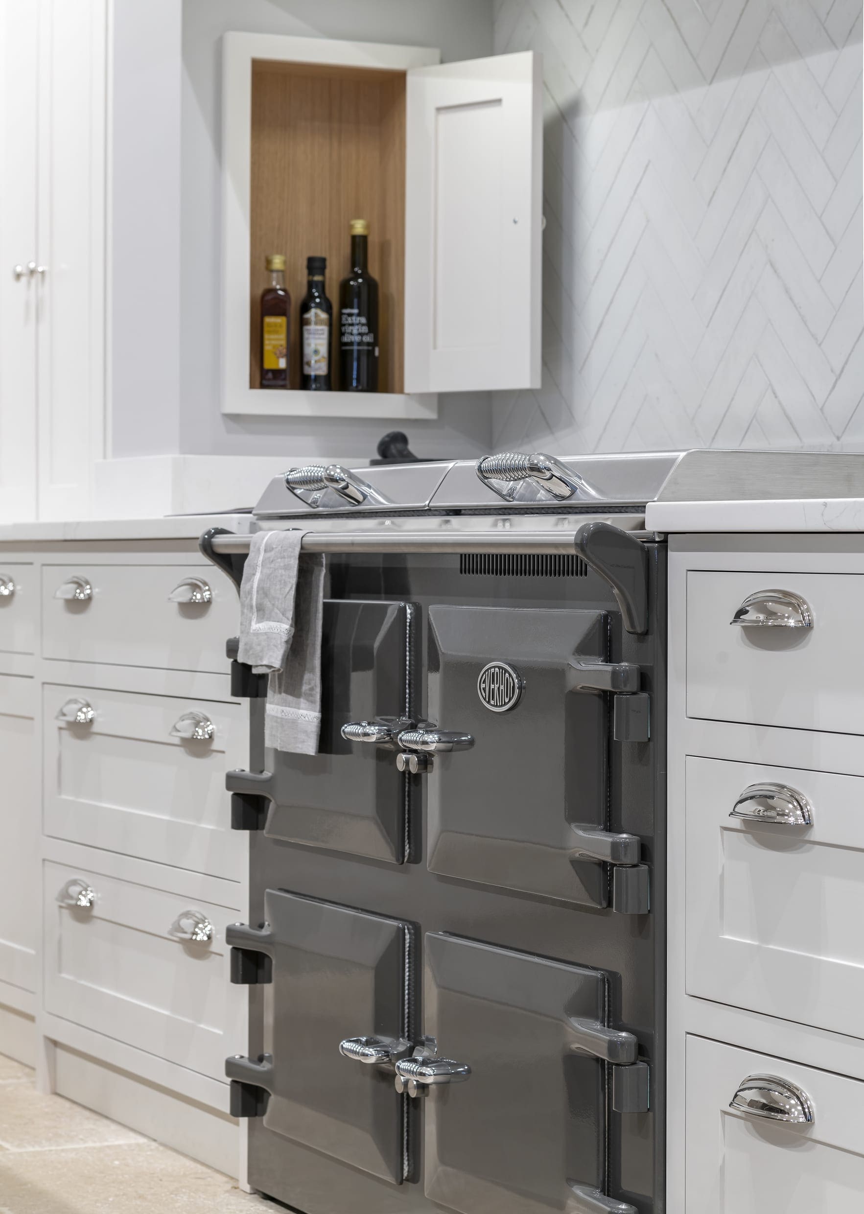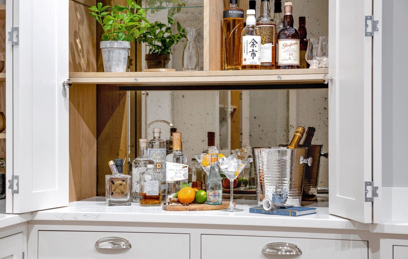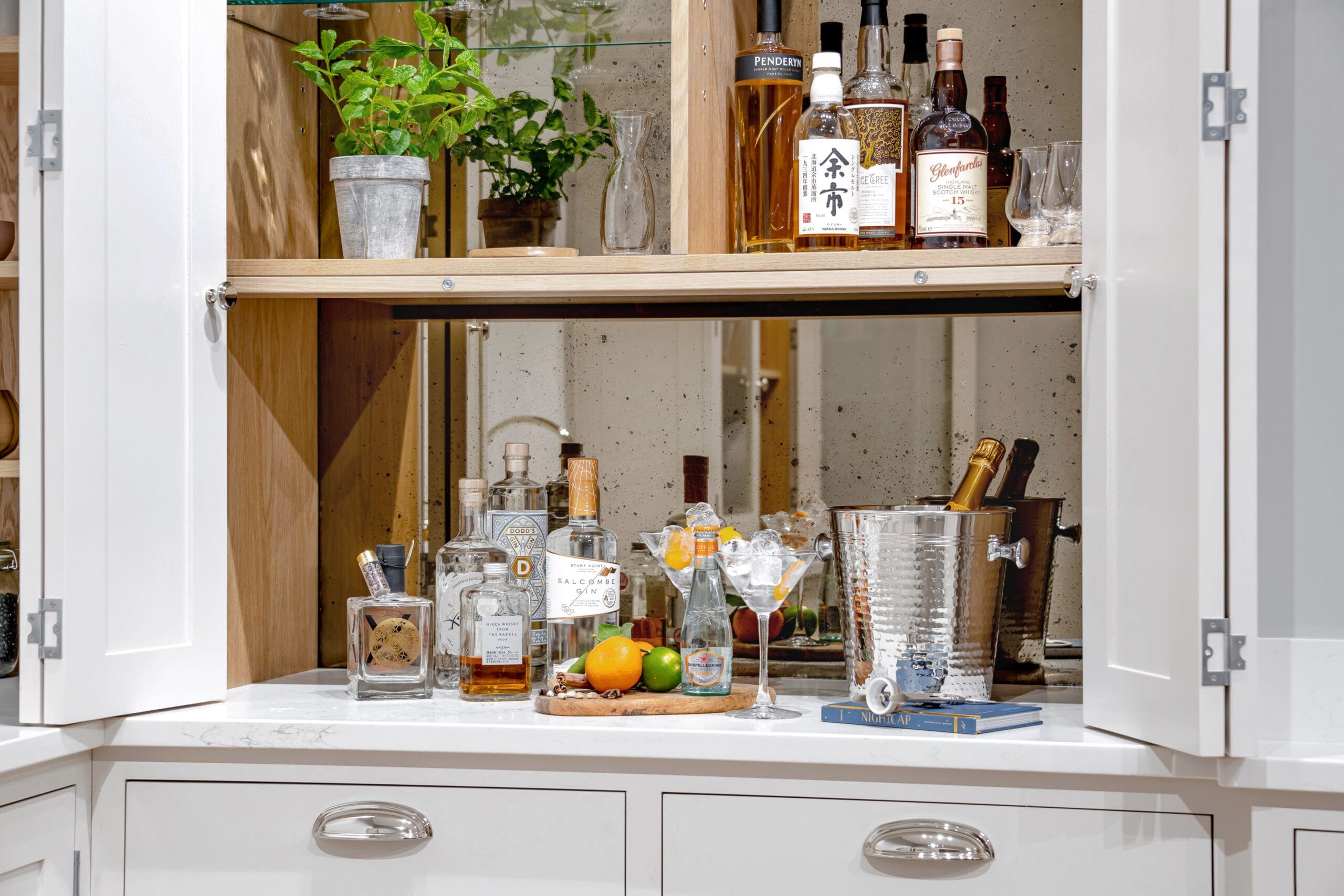 The combination of a tall freestanding element, a feature mantle surround and bi-fold cabinetry add an impressive scale to this design, while also being stunningly practical both inside and out. A real social workhorse, this design suits large, tall spaces where traditional kitchen units simply can’t create the right look. Muted tones of grey and brown are contrasted with understated accents and a little a touch of luxe.