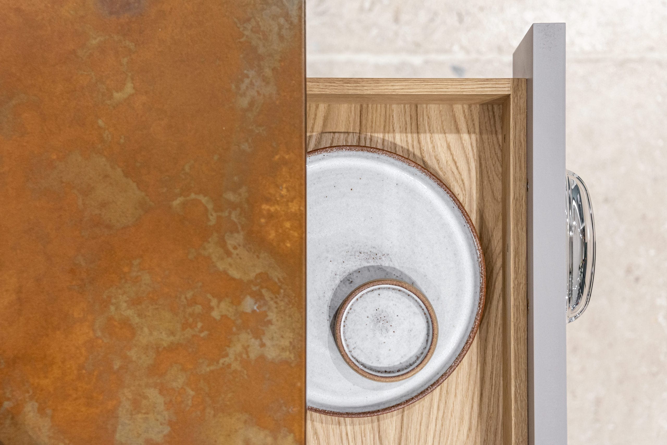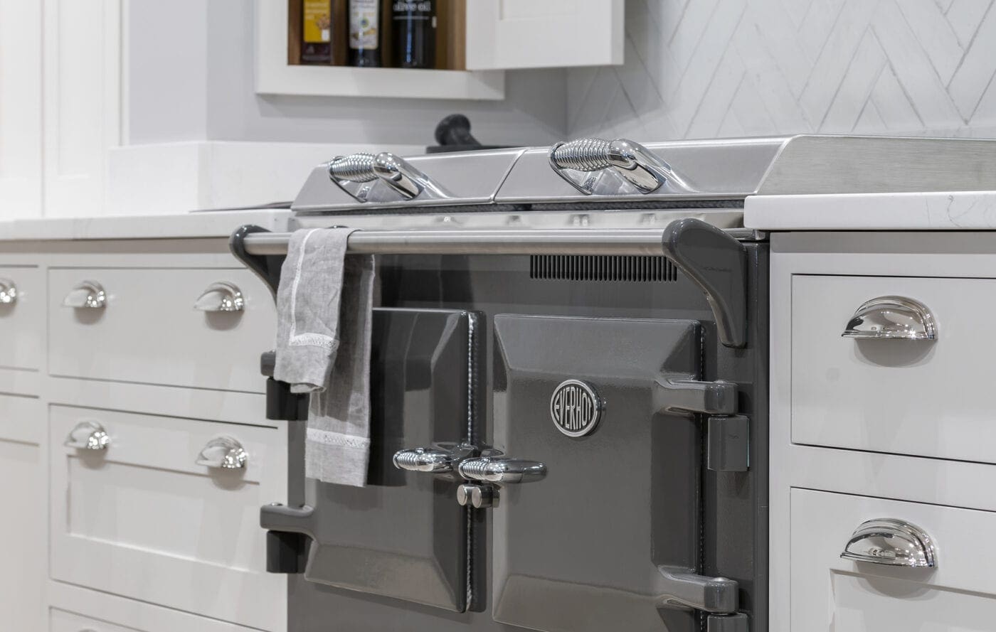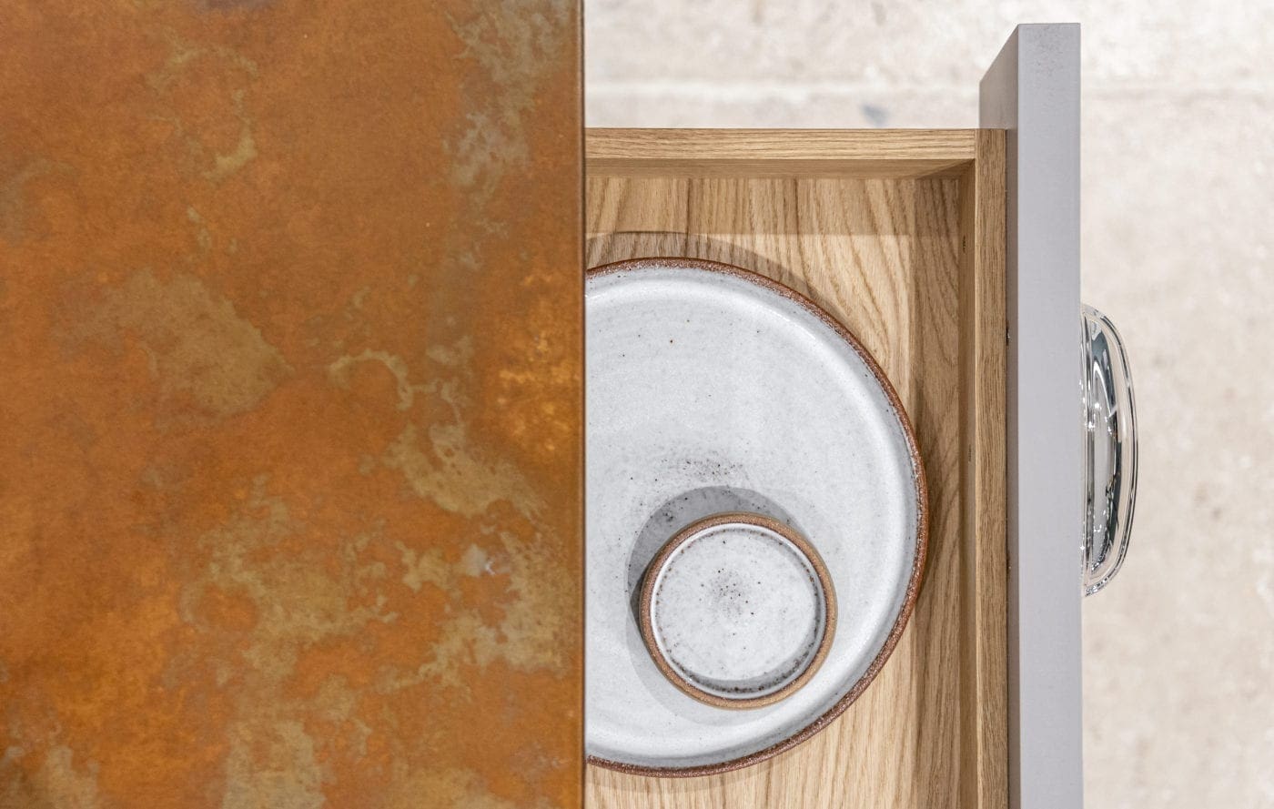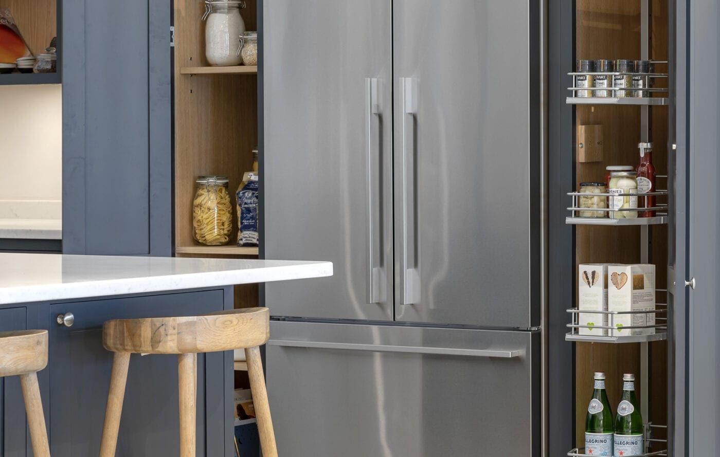 The combination of a tall freestanding element, a feature mantle surround and bi-fold cabinetry add an impressive scale to this design, while also being stunningly practical both inside and out. A real social workhorse, this design suits large, tall spaces where traditional kitchen units simply can’t create the right look. Muted tones of grey and brown are contrasted with understated accents and a little a touch of luxe.