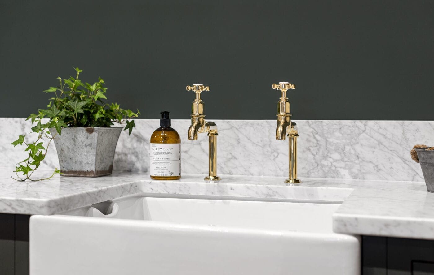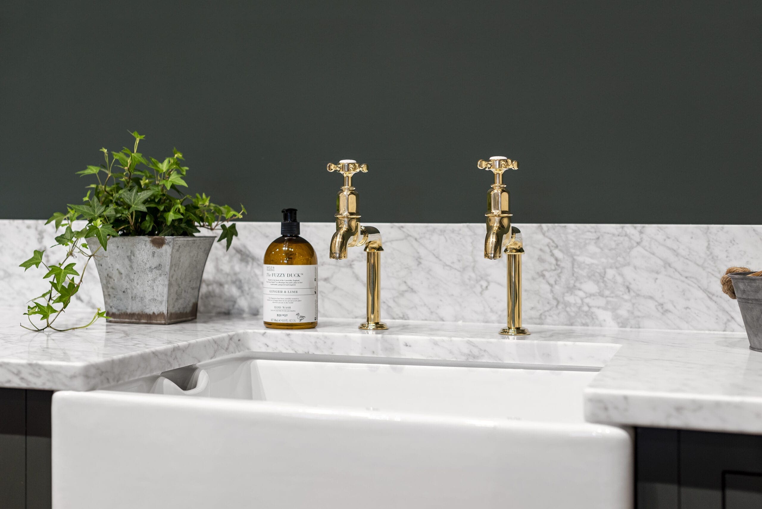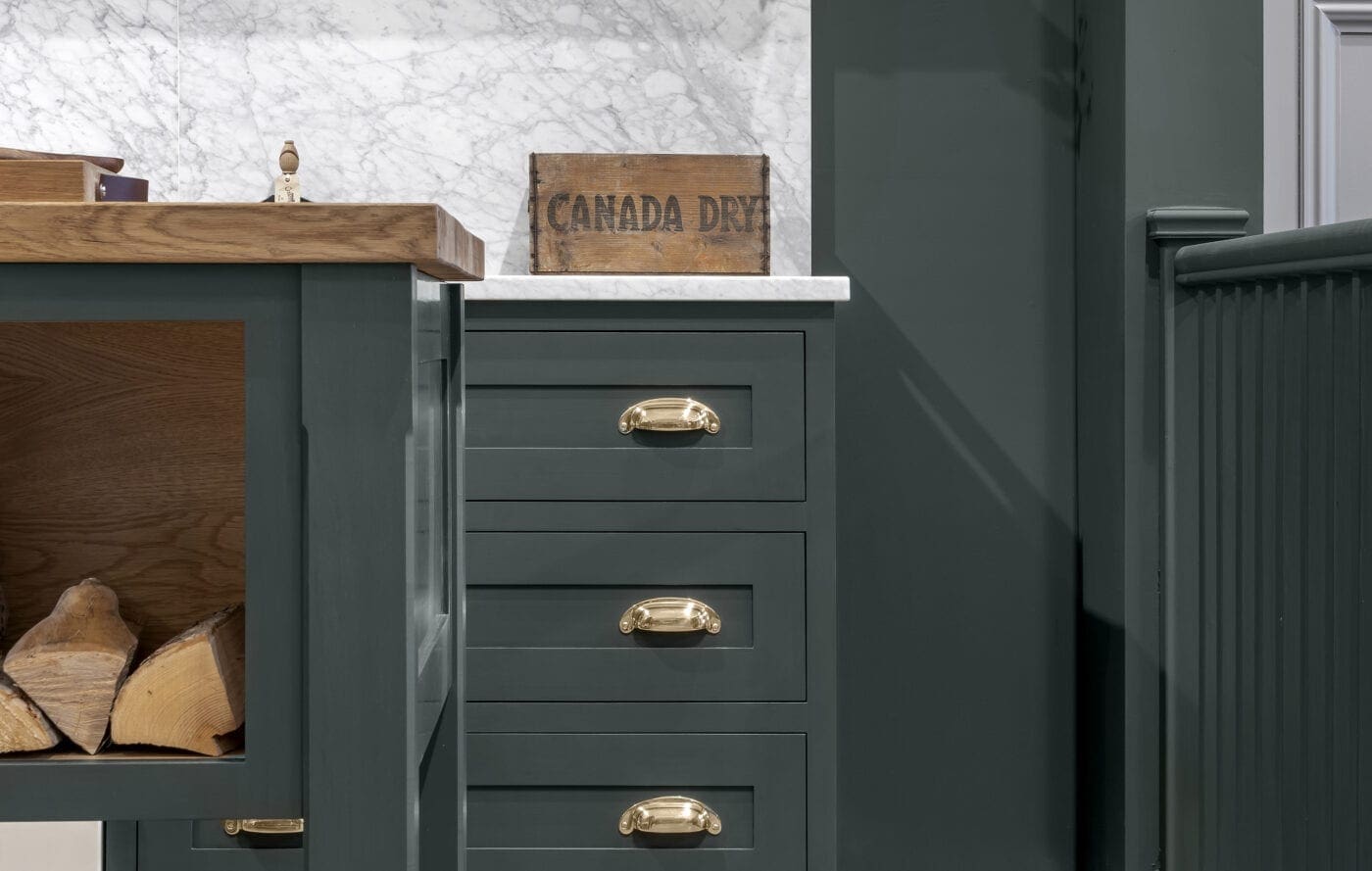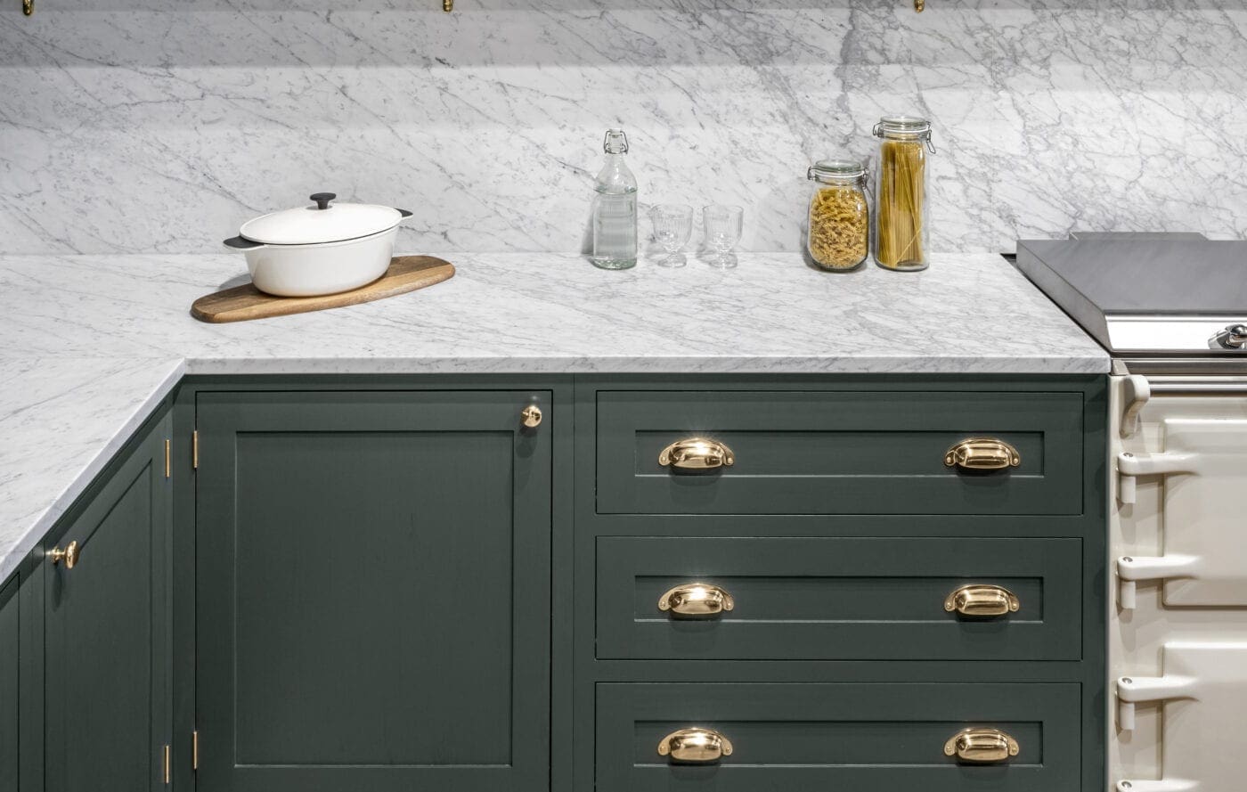 This kitchen proves that even small kitchens can create a big impact when carefully designed and expertly detailed. We love designing kitchens in challenging spaces that have to perform as well as kitchens twice their size. And often less is more. Beautiful natural Carrara Marble contrasts perfectly with the deep, moody green and the polished solid brass hardware – creating the perfect combination of richness and texture.